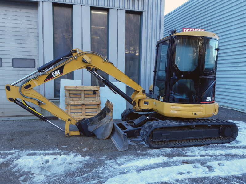 Mini pelle Caterpillar 304 CR de 4,3 tonnes adaptée aux travaux de terrassement et d’aménagement. Année 2005 avec 4 400 heures de fonctionnement, machine d’occasion livrée avec kit d’attache rapide et quatre godets.
