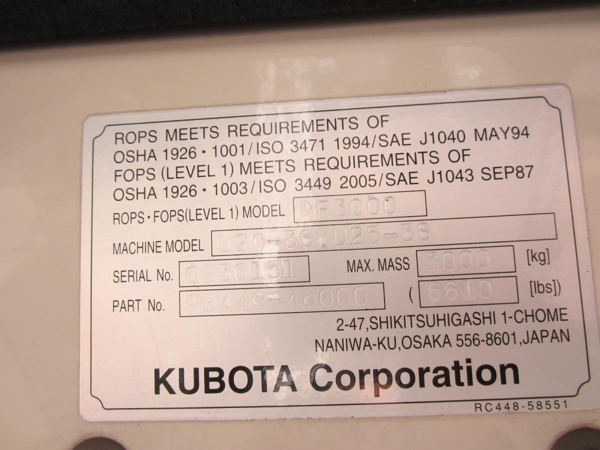 Caractéristiques techniques — Marque : Kubota, modèle : U25-3, année : 2005. Heures d’utilisation : 6333 h. Poids : 2,6 tonnes. Chenilles : en bon état assurant adhérence et stabilité.