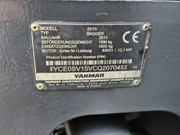 Caractéristiques techniques — Modèle Yanmar SV15; année fabrication 2013; poids opérationnel approximatif 1500 kg offrant stabilité compacité espaces restreints; motorisation diesel Yanmar économe fiable; profondeur creusement maximale environ 2,3 mètres selon configuration; portée horizontale permettant un travail efficace sans repositionnement fréquent; train chenilles caoutchouc préservant sols fragiles revêtements sensibles; cabine fermée chauffée protégeant opérateur intempéries froid améliorant le confort conditions de travail difficiles; attache rapide type CSW01 compatible accessoires large gamme marché; équipé godet terrassement largeur 30 cm adapté tranchées étroites finitions précises; raboteuse fraisage largeur 100 cm pour préparation surfaces béton asphalte avant coulage revêtement; installation complète marteau hydraulique brise-roche inclus raccordements circuit hydraulique opérationnels; rotation tourelle 360° facilitant couverture maximale zone de travail sans déplacement machine; commandes hydrauliques leviers ergonomiques réponse progressive précise.